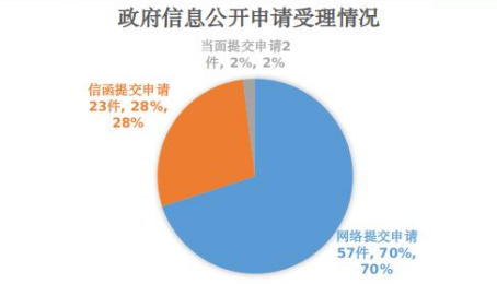 2021年以來,市政府高度重視依申請公開工作,進一步完善政府信息公開申請的接收、登記、辦理、審核、答復、歸檔等環節制度規范,堅持依法規范辦理,狠抓依申請辦理質量,切實保障公眾知情權,積極化解社會矛盾,不斷增強人民群眾獲得感和幸福感。市政府本年度內共受理政府信息公開申請82件,依法依規答復81件,結轉下年度繼續辦理1件。其中,網絡提交申請的57件,占70%;信函提交申請的23件,占28%;當面提交申請2件,占2%。