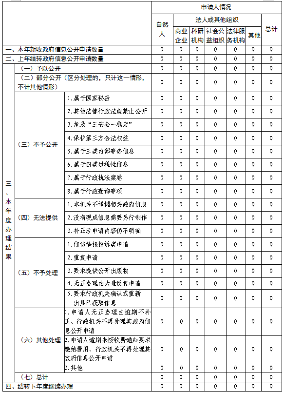 本報告內(nèi)容包括:總體情況、主動公開政府信息情況、收到和處理政府信息公開申請情況、政府信息公開行政復(fù)議及行政訴訟情況、存在的主要問題及改進情況、其他事項,以及相關(guān)指標統(tǒng)計附表等。報告中所列數(shù)據(jù)統(tǒng)計期限從2023年1月1日到12月31日止。報告電子版可從乳山市發(fā)展和改革局網(wǎng)站(網(wǎng)址:http://m.fwzgg.cn/col/col69885/index.html)查閱或下載。公眾如需進一步咨詢了解相關(guān)信息,請與乳山市發(fā)改局聯(lián)系(地址:乳山市城區(qū)街道府前路5號,電話:6652573)。