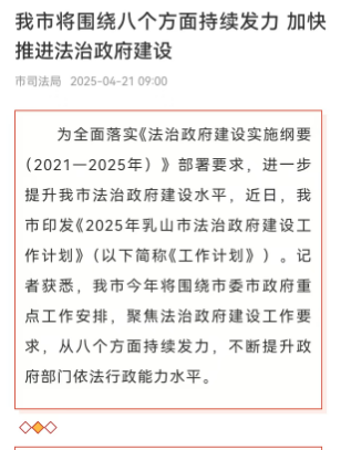 為全面落實《法治政府建設實施綱要(2021-2025年)》部署要求,進一步提升我市法治政府建設水平,近日,我市印發《2025年乳山市法治政府建設工作計劃》(以下簡稱《工作計劃》)。記者獲悉,我市今年將圍繞市委市政府重點工作安排,聚焦法治政府建設工作要求,從八個方面持續發力,不斷提升政府部門依法行政能力水平。