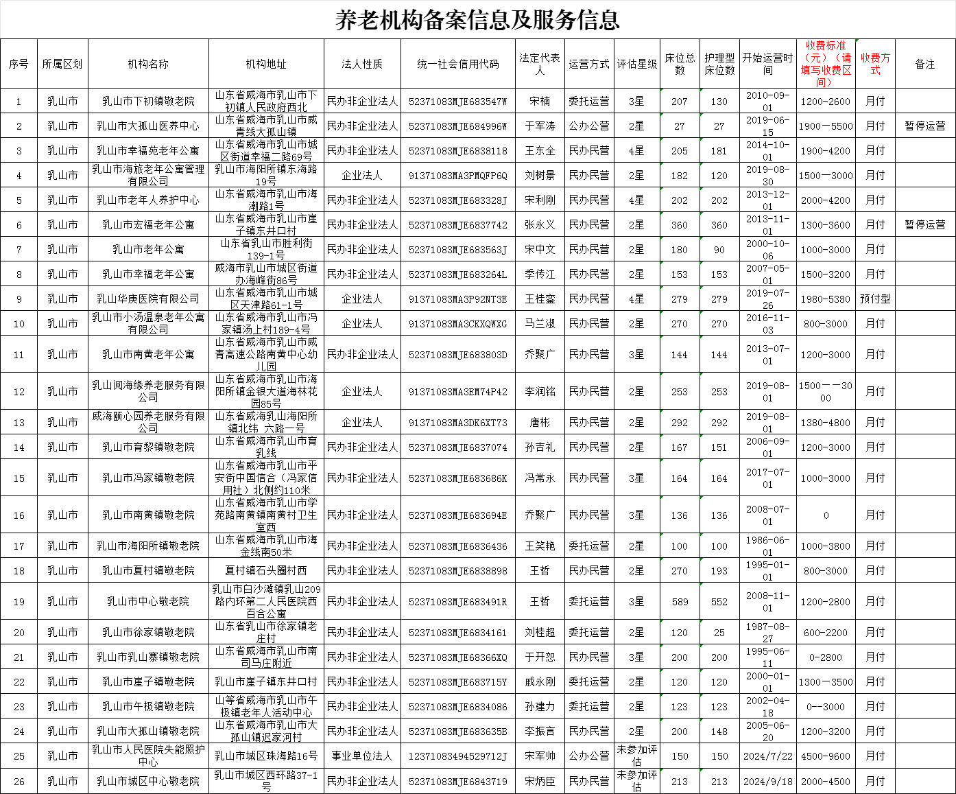 乳山市民政局2025年5月養老機構備案信息及服務信息