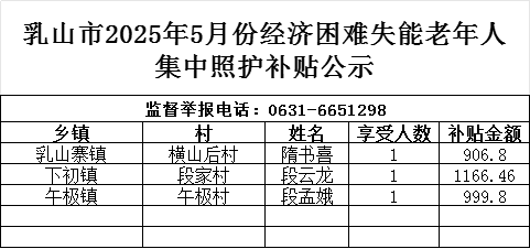 乳山市5月份經濟困難失能老年人集中照護補貼公示