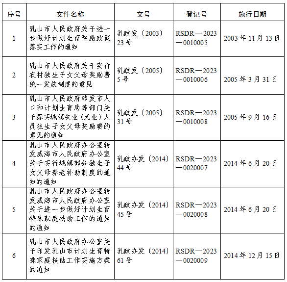 按照《山東省行政規(guī)范性文件制定和監(jiān)督管理辦法》《山東省行政規(guī)范性文件評估暫行辦法》等有關(guān)規(guī)定,經(jīng)評估,決定《乳山市人民政府關(guān)于進一步做好計劃生育獎勵政策落實工作的通知》等6件行政規(guī)范性文件廢止。凡廢止的行政規(guī)范性文件,自本決定發(fā)布之日起一律停止執(zhí)行,不再作為行政管理的依據(jù)。