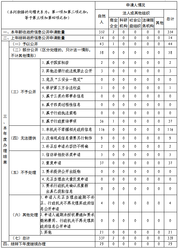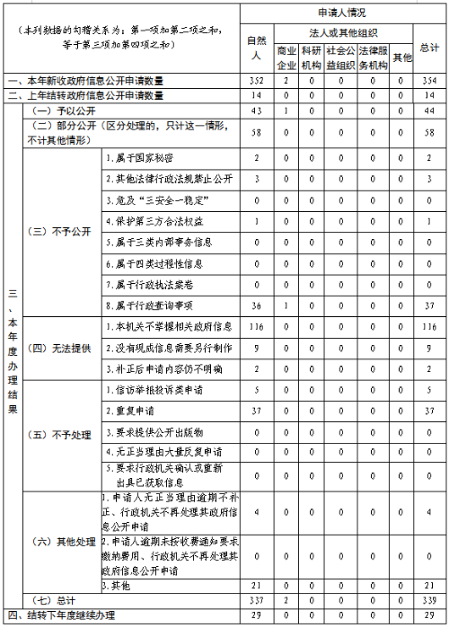 2.依申請公開工作方面。進(jìn)一步完善《乳山市依申請公開答復(fù)流程圖》,嚴(yán)格按照《政府信息公開條例》要求,規(guī)范受理、依法辦理政府信息公開申請。全市共處理信息公開申請368件,與去年相比增加248件,其中予以公開44件、部分公開58件、不予公開43件、無法提供127件、不予處理42件、其他處理25件、結(jié)轉(zhuǎn)下年度繼續(xù)辦理29件。因依申請公開工作引發(fā)行政復(fù)議20件、行政訴訟2件,無敗訴案件。