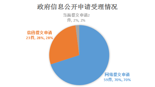 2021年以來,市政府高度重視依申請公開工作,進一步完善政府信息公開申請的接收、登記、辦理、審核、答復、歸檔等環節制度規范,堅持依法規范辦理,狠抓依申請辦理質量,切實保障公眾知情權,積極化解社會矛盾,不斷增強人民群眾獲得感和幸福感。市政府本年度內共受理政府信息公開申請84件,依法依規答復81件,結轉下年度繼續辦理3件。其中,網絡提交申請的59件,占70%;信函提交申請的23件,占28%;當面提交申請2件,占2%。