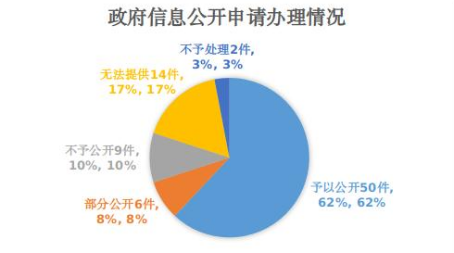 從辦理結果情況看,予以公開50件,占62%;部分公開6件,占8%;不予公開9件,占10%;無法提供14件,占17%;不予處理2件,占3%。無向政府信息公開申請人進行收費的情況。