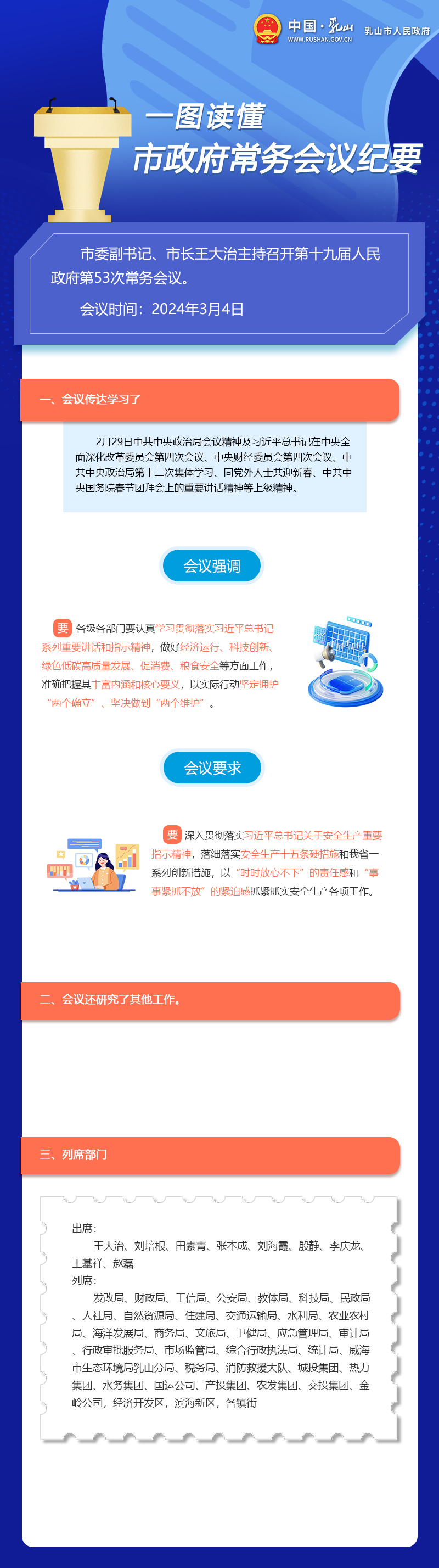 2024年3月4日,市委副書(shū)記、市長(zhǎng)王大治主持召開(kāi)第十九屆人民政府第53次常務(wù)會(huì)議。