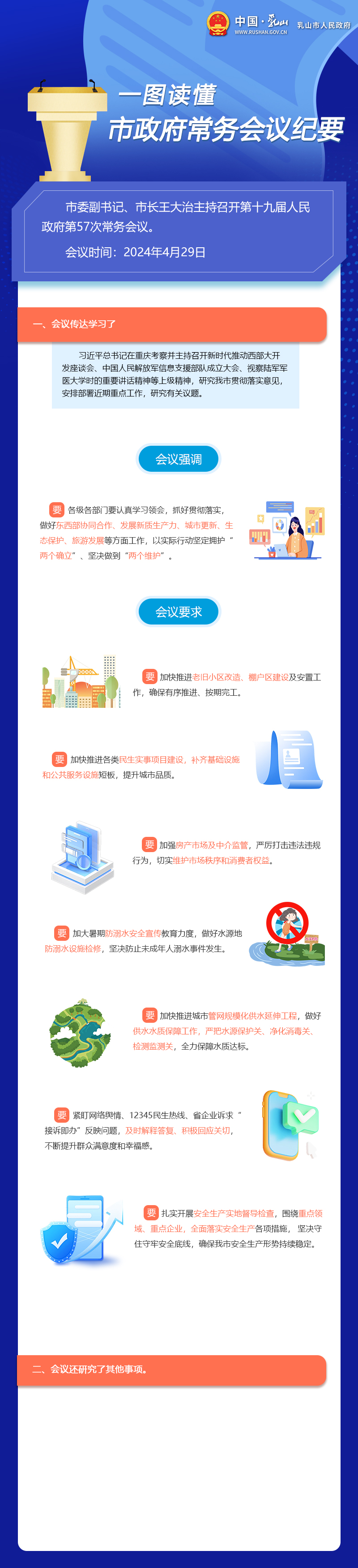 2024年4月29日,市委副書記、市長王大治主持召開第十九屆人民政府第57次常務(wù)會(huì)議,傳達(dá)學(xué)習(xí)習(xí)近平總書記在重慶考察并主持召開新時(shí)代推動(dòng)西部大開發(fā)座談會(huì)、中國人民解放軍信息支援部隊(duì)成立大會(huì)、視察陸軍軍醫(yī)大學(xué)時(shí)的重要講話精神等上級(jí)精神,研究我市貫徹落實(shí)意見,安排部署近期重點(diǎn)工作,研究有關(guān)議題。