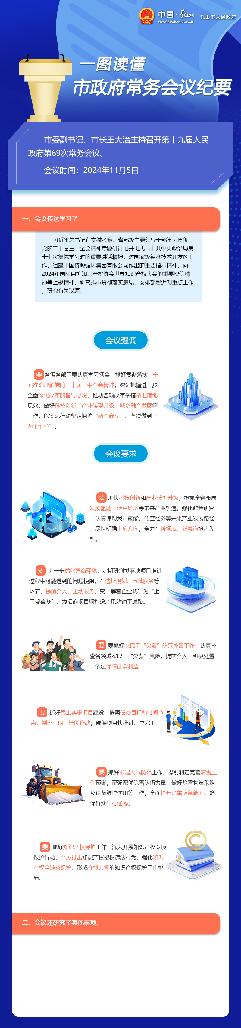 會議強調,各級各部門要認真學習領會,抓好貫徹落實,全面準確理解黨的二十屆三中全會精神,深刻把握進一步全面深化改革的指導思想,推動各項改革舉措精準落地見效,做好科技創新、產業轉型升級、城鄉融合發展等工作,以實際行動堅定擁護“兩個確立”、堅決做到“兩個維護”。要加快科技創新和產業轉型升級,搶抓全省布局發展氫能、低空經濟等未來產業機遇,強化政策研究,認真謀劃我市氫能、低空經濟等未來產業發展路徑,盡快明確主攻方向,全力在新領域、新賽道搶占先機。要進一步優化營商環境,定期研判擬落地項目推進過程中可能遇到的問題梗阻,在選址規劃、審批服務等環節,提前介入、主動服務,變“等著企業找”為“上門幫著辦”,為招商項目順利投產見效鋪平道路。要抓好農民工“欠薪”防范處置工作,認真排查各領域農民工“欠薪”風險,提前介入、積極處置,依法保障群眾利益。要抓好民生實事項目建設,按照任務目標和時間節點,倒排工期、掛圖作戰,確保項目快推進、早完工。要抓好極端天氣防范工作,提前制定完善清雪工作預案,配強配優除雪隊伍力量,做好除雪物資采購及設備維護使用等工作,全面提升除雪應急能力,確保群眾出行通暢。要抓好知識產權保護工作,深入開展知識產權專項保護行動,嚴厲打擊知識產權侵權違法行為,強化知識產權全鏈條保護,形成齊抓共管的知識產權保護工作格局。