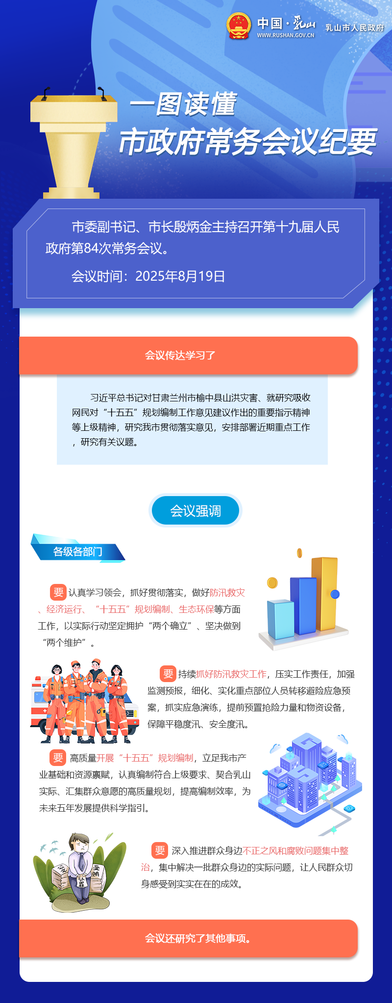 2025年8月19日,市委副書(shū)記、市長(zhǎng)殷炳金主持召開(kāi)第十九屆人民政府第84次常務(wù)會(huì)議,傳達(dá)學(xué)習(xí)習(xí)近平總書(shū)記對(duì)甘肅蘭州市榆中縣山洪災(zāi)害、就研究吸收網(wǎng)民對(duì)“十五五”規(guī)劃編制工作意見(jiàn)建議作出的重要指示精神等上級(jí)精神,研究我市貫徹落實(shí)意見(jiàn),安排部署近期重點(diǎn)工作,研究有關(guān)議題。