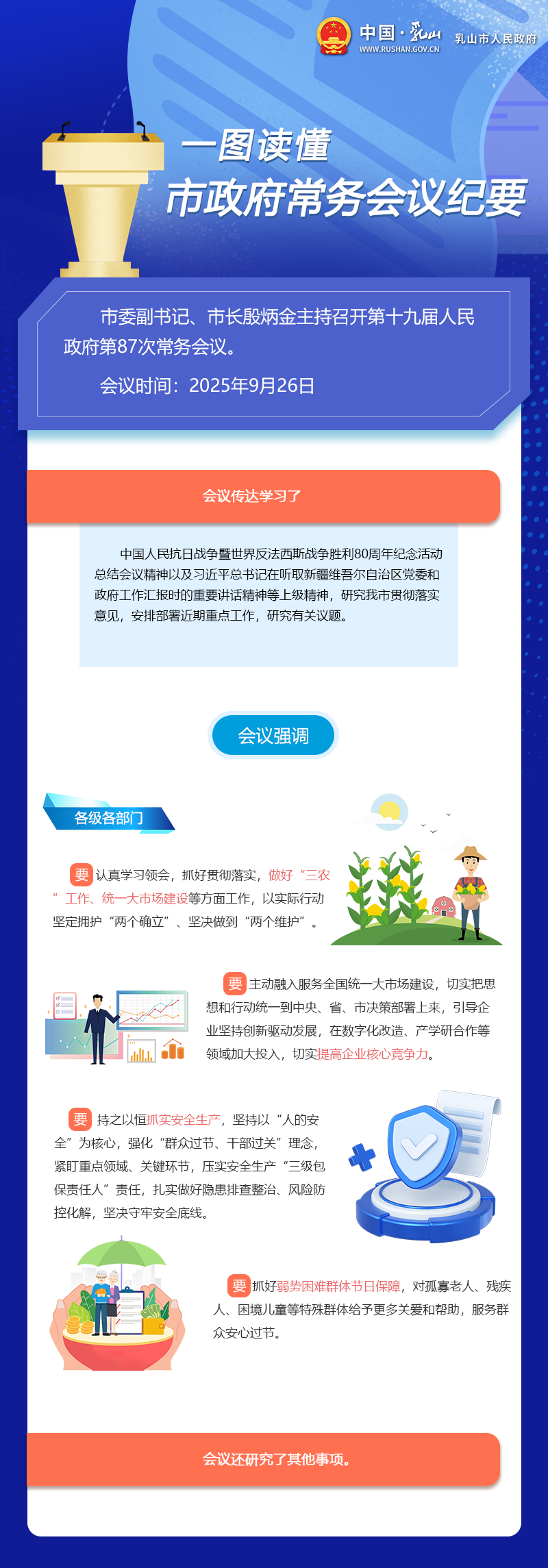 2025年9月26日,市委副書記、市長(zhǎng)殷炳金主持召開第十九屆人民政府第87次常務(wù)會(huì)議,傳達(dá)學(xué)習(xí)中國(guó)人民抗日戰(zhàn)爭(zhēng)暨世界反法西斯戰(zhàn)爭(zhēng)勝利80周年紀(jì)念活動(dòng)總結(jié)會(huì)議精神以及習(xí)近平總書記在聽取新疆維吾爾自治區(qū)黨委和政府工作匯報(bào)時(shí)的重要講話精神等上級(jí)精神,研究我市貫徹落實(shí)意見(jiàn),安排部署近期重點(diǎn)工作,研究有關(guān)議題。
